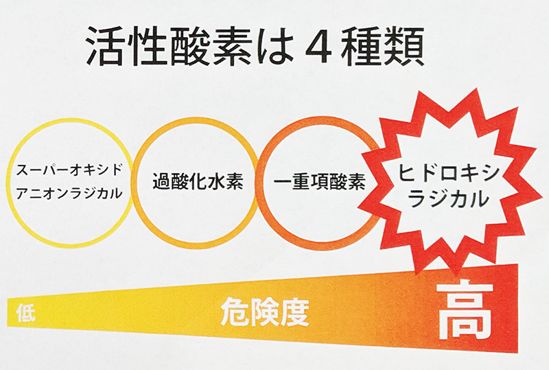 活性酸素には「スーパーオキシド」「過酸化水素」「一重頂酸素」「ヒドロキシルラジカル」などありますが、中でも「ヒドロキシルラジカル」は酸化力がもっとも強力で、危険度が高い活性酸素です。生活習慣病の90%が活性酸素によると言われており、その活性酸素の(ヒドロキシラジカル)を消去します。